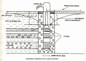 Es una perforación vertical que se hace en el terreno de forma cilíndrica y de diámetro mucho menor que su profundidad. Una vez hecha la perforación se instala un tubo vertical dentro de ella, el cual tiene unas secciones de tubería llamadas filtros que se instalan en frente de los acuíferos para que el agua penetre y pueda ser bombeada a la superficie del terreno. En la figura se pueden observar los diferentes parámetros hidráulicos de un pozo.